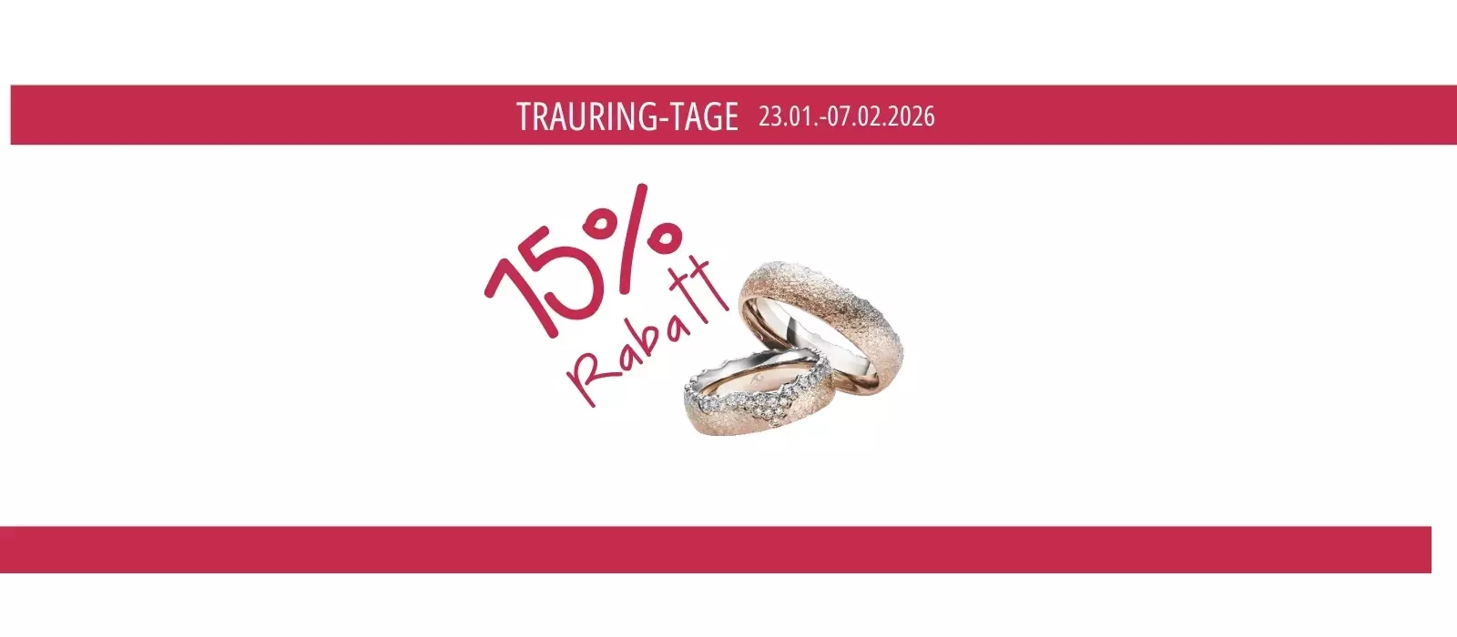 Im Aktionszeitraum "TRAURING-TAGE" erstatten wir Ihnen 15% Rabatt auf den Kaufpreis Ihrer Trauringe.